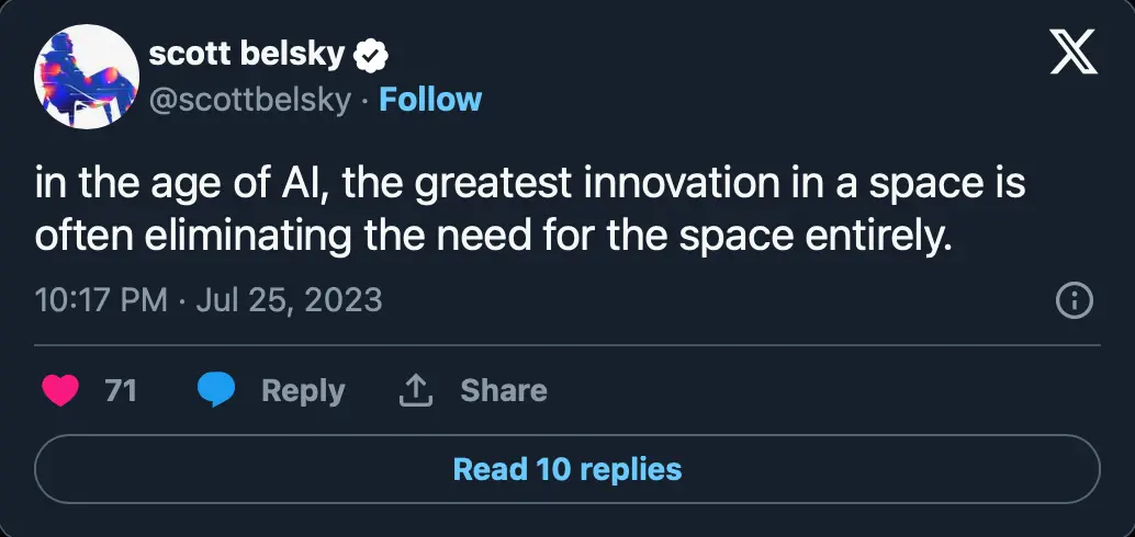 Belsky escreveu pela primeira vez que, na era da IA, “a maior inovação em um espaço é muitas vezes eliminar totalmente a necessidade do espaço”.