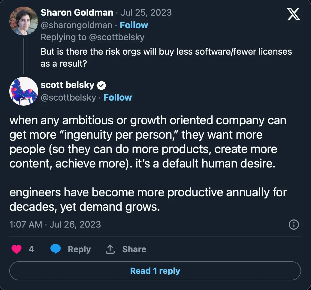 Mas quando questionado pela VentureBeat se existe o risco de as organizações comprarem menos software de design gráfico ou menos licenças como resultado de ferramentas de IA, Belsky respondeu que “quando qualquer empresa ambiciosa ou orientada para o crescimento pode obter mais 'engenhosidade por pessoa', ela quer mais pessoas (para que possam fazer mais produtos, criar mais conteúdo, alcançar mais). é um desejo humano padrão. os engenheiros tornaram-se mais produtivos anualmente durante décadas, mas a demanda cresce.”